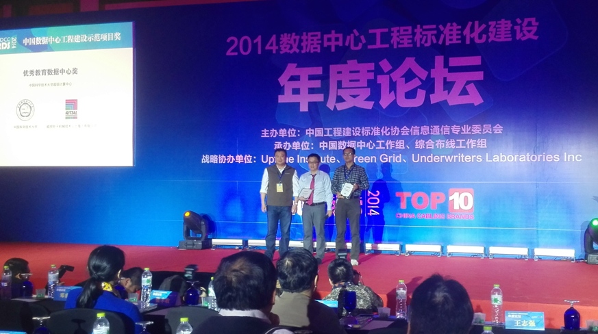 11月28日,中国数据中心工程标准化建设年度论坛暨中国优秀数据中心颁奖典礼在北京隆重举行,中国科大超级计算中心在2014年中国优秀数据中心评选中荣获“优秀教育数据中心奖”。